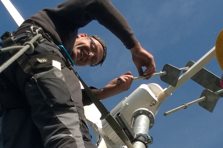 Montage einer Windkraftanlage mit 3,5 Meter Rotordurchmesser in ca. 65 Metern Höhe.